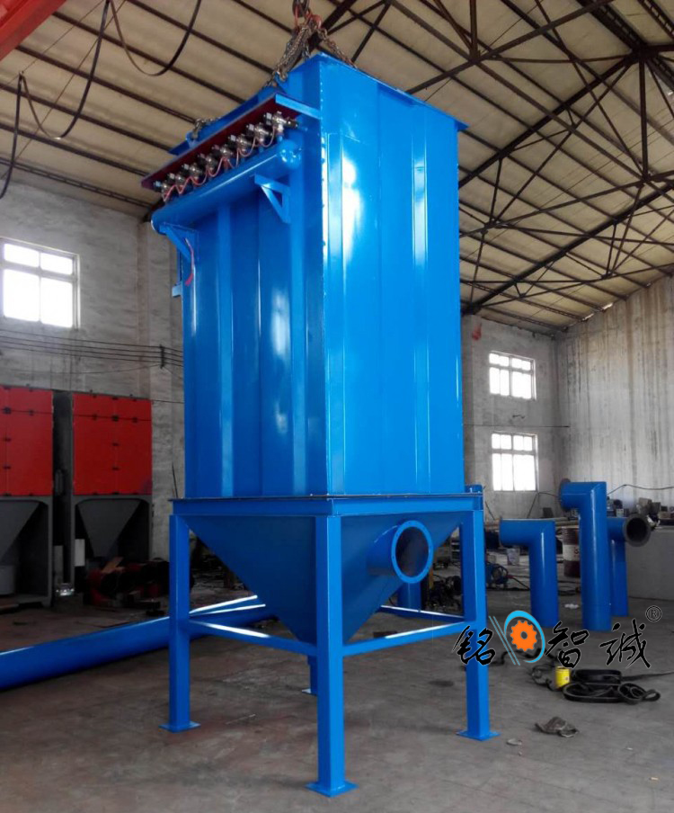 本系列除塵器由殼體、灰斗、卸灰裝置和清灰系統等組成,該系列除塵器共有六個規格,分A、B二型,A型設標準灰斗;B型無灰斗。當含塵氣體進入除塵器,粗顆粒粉塵直接落入灰斗,起到預吸塵作用,含塵氣體通過內部裝有金屬骨架的濾袋,粉塵被捕集在濾袋外表面,凈化后的氣體經清潔室,由風機排出,除塵器的清灰其程序是由控制器根據工藝條件調整確定的。除塵器工作時,隨著濾袋外表面的積灰逐漸增多,除塵器的阻力也不斷增加,當達到設定值時,(規定的阻力上限或一定時間間隔)清灰控制器發出清灰指令,將脈沖閥打開,在很短的時間內噴吹0.5-0.7MPa的高壓氣體,將濾袋吹脹,變形振動,把濾袋外表面的粉塵清除下來并落入灰斗,清灰工作全部結束,除塵器恢復正常工作。